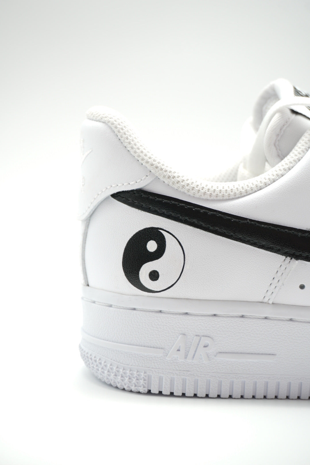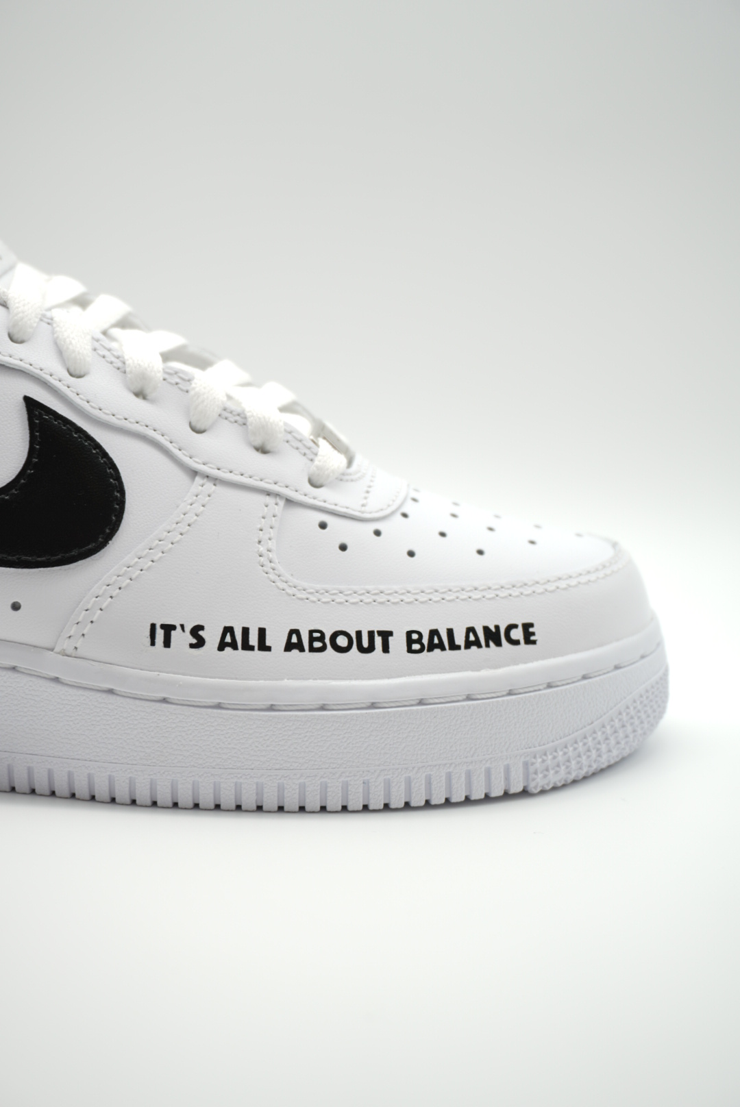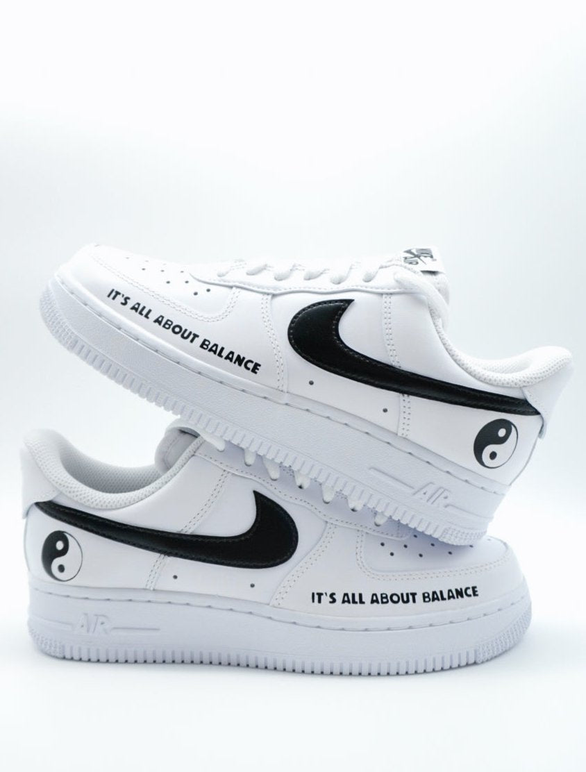 Diese Custom-Sneaker vereinen minimalistische Eleganz und symbolische Bedeutung. Die klassische Nike-Silhouette wird durch das kontrastreiche Design in Schwarz und Weiß verstärkt. An den Seiten des Schuhs prangt ein handgezeichneter Yin-Yang-Symbol, welches das zentrale Thema der Balance und Harmonie hervorhebt. Der Schriftzug „It’s all about balance“ auf der Außenseite unterstreicht die Botschaft dieser Sneaker.