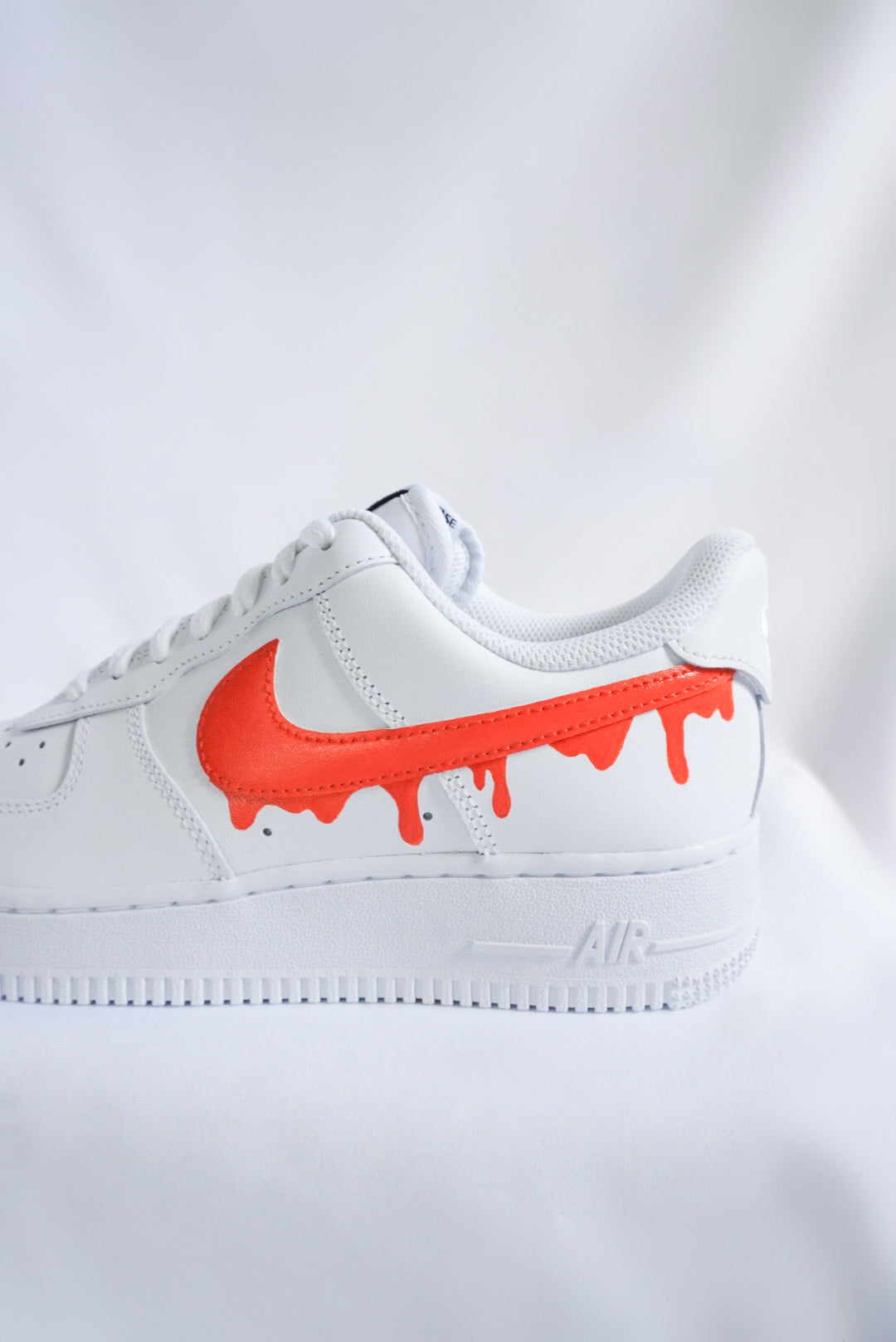 Die weißen Nike Air Force 1 wurden mit einem auffälligen, handbemalten orangen Swoosh-Logo verziert, das wie flüssige Farbe aussieht und dem Schuh ein einzigartiges, kreatives Design verleiht. Jeder Schuh ist ein Unikat, sorgfältig von Hand bemalt, was ihm eine persönliche Note und besondere Individualität verleiht. Du kannst dieses Modell auch in deiner Wunschfarbe bestellen!