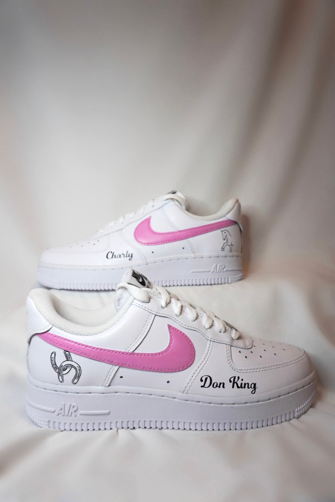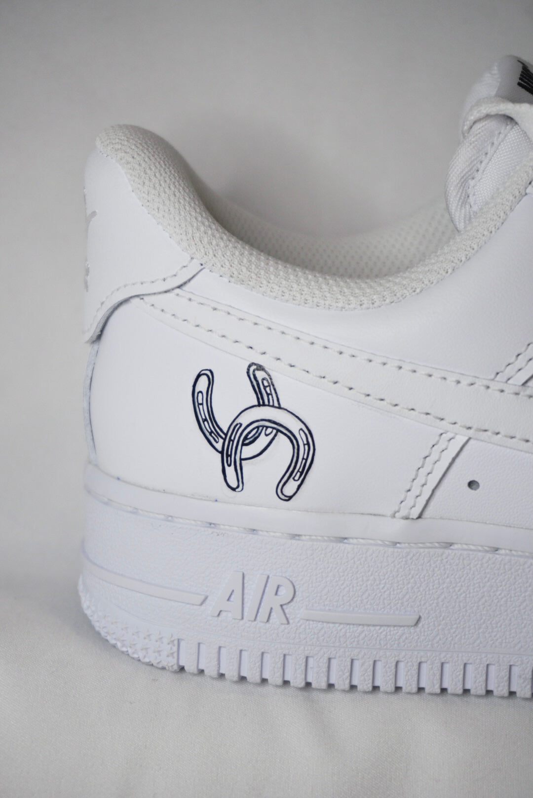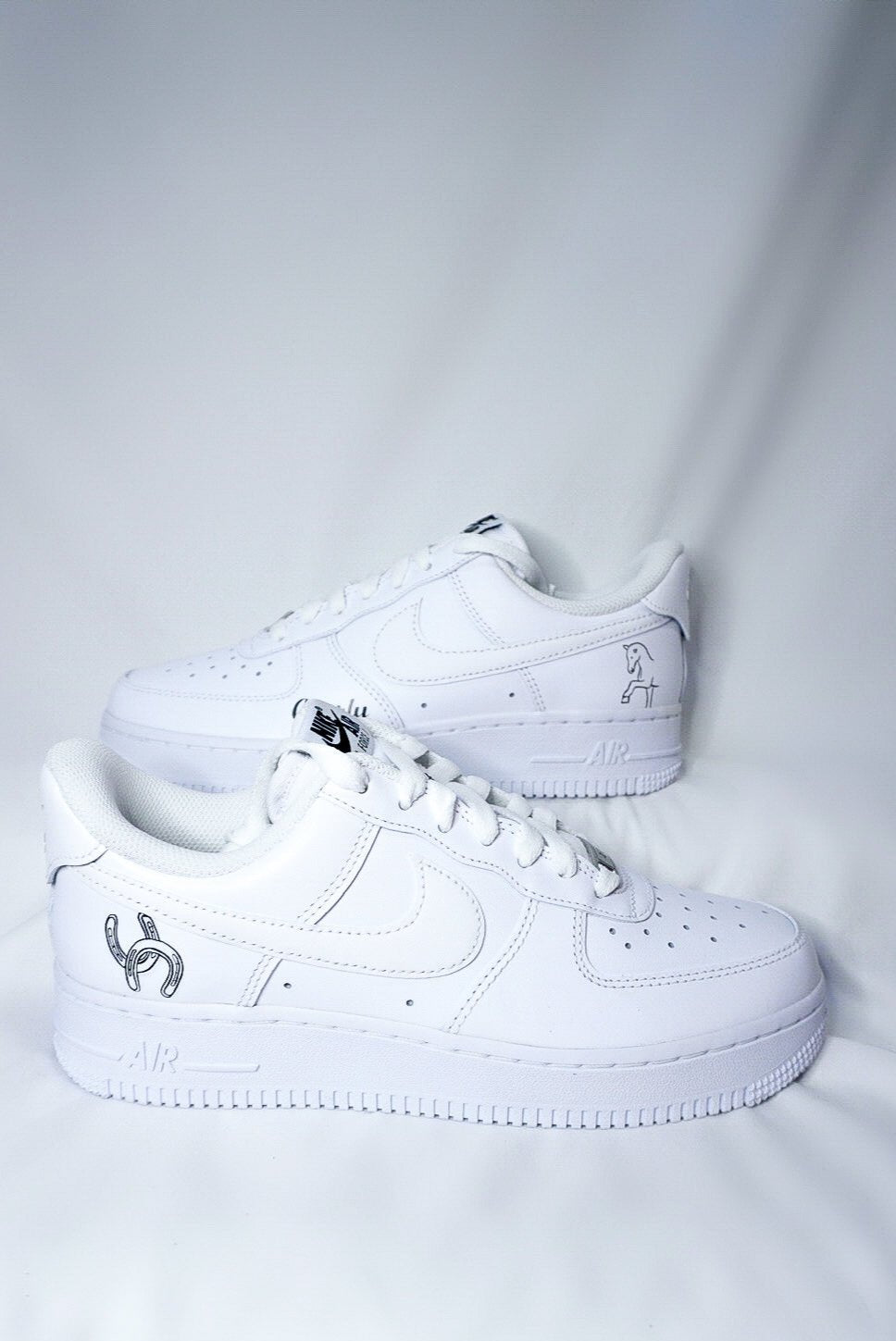 Diese Nike Air Force 1 Schuhe zeichnen sich durch ihre individuelle Gestaltung und die handbemalte Oberfläche aus. Die weißen Sneakers wurden mit eleganten Details zum Thema Reiten personalisiert. Ein Hufeisen und ein stilisierter Pferdekopf zieren die Seiten der Schuhe. Hier hast du die Möglichkeit, den Schuhen eine noch persönlichere Note zu verleihen, indem du die Farbe und die Namen anpassen kannst.