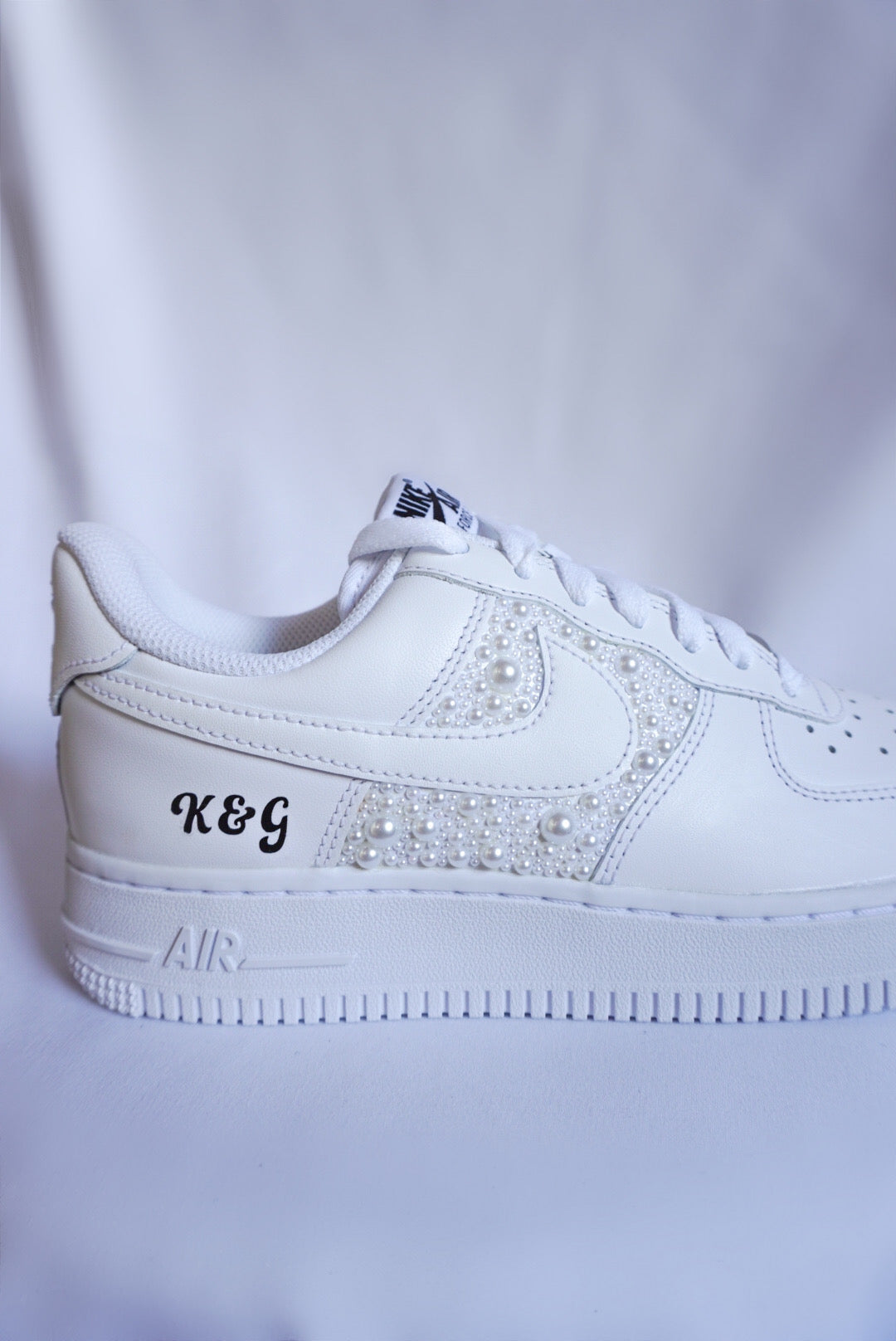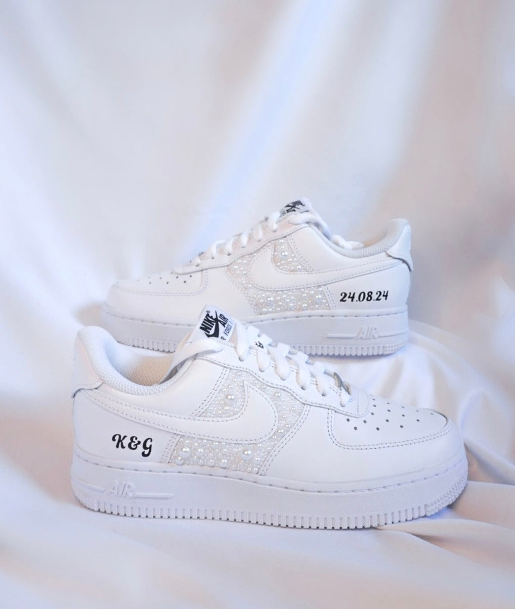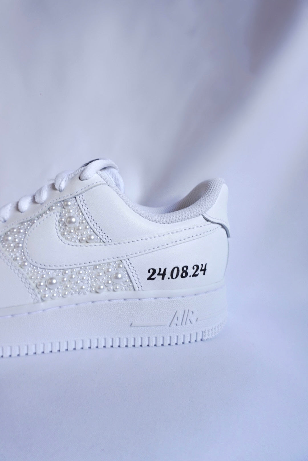 Diese Sneaker zeichnen sich durch funkelnde Perlen aus, die sorgfältig von Hand auf die seitlichen Bereiche des Schuhs geklebt werden. Zusätzlich werden auf die Außenseite der Schuhe die Initialen sowie das Hochzeitsdatum von Hand aufgemalt, was den Schuhen eine sehr persönliche und besondere Bedeutung gibt. Diese Mischung aus handgefertigten Perlenverzierungen und handbemalten Details macht die Sneakers zu einem perfekten und individuellen Accessoire für den Hochzeitstag.