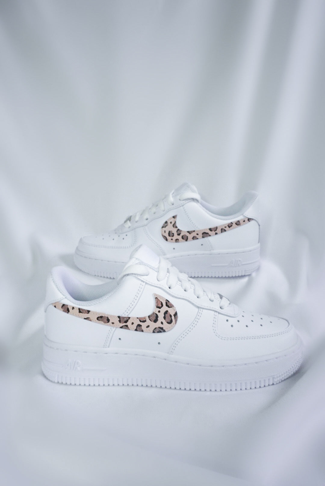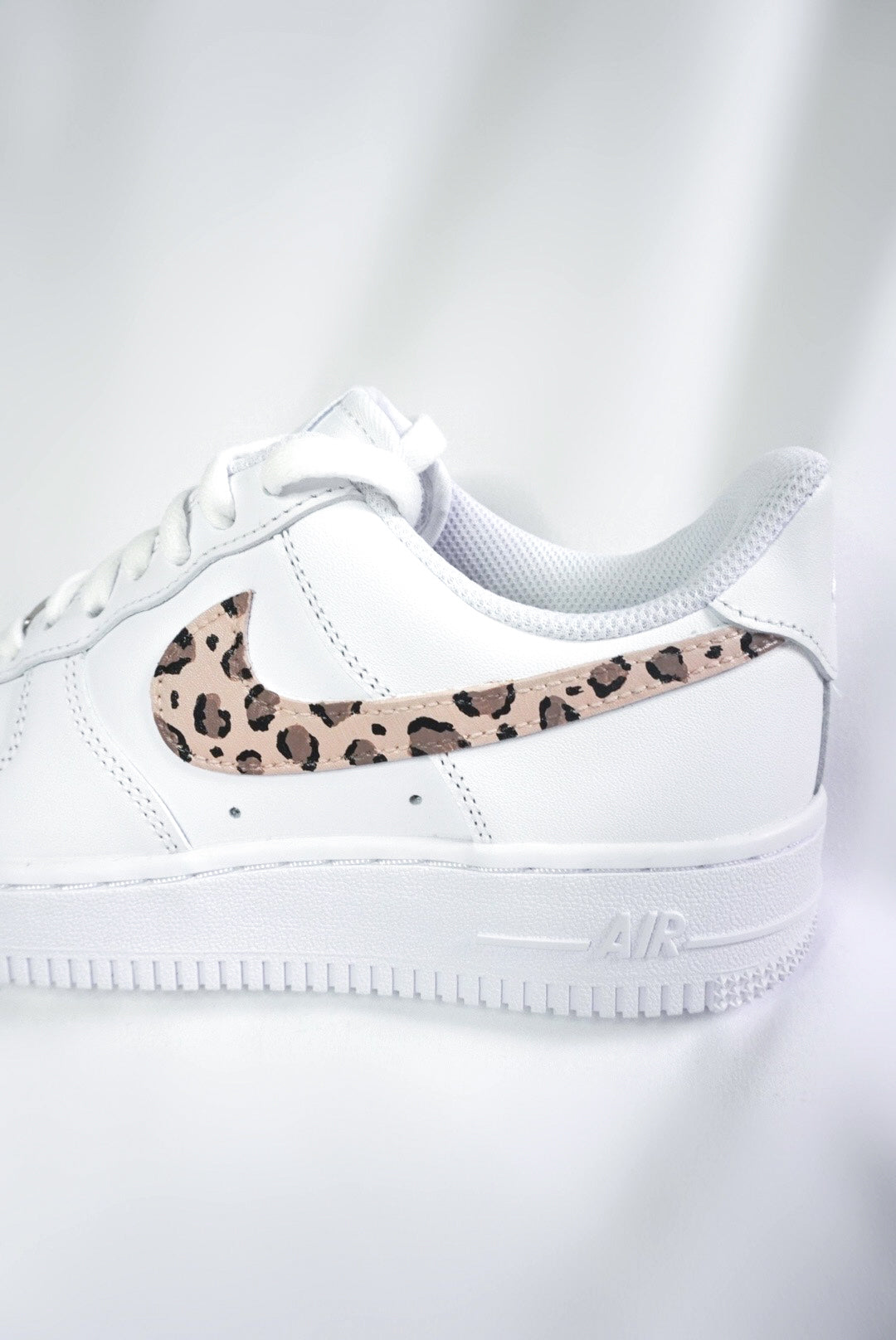 Diese Custom Sneaker zeichnen sich durch das klassische, klare Design der Air Force 1 Serie aus und haben eine auffällige Besonderheit: das Nike-Logo (Swoosh) ist handbemalt im Leopardenmuster. Diese individuelle Gestaltung verleiht den Schuhen einen einzigartigen Look, der sie von den standardisierten Modellen abhebt.