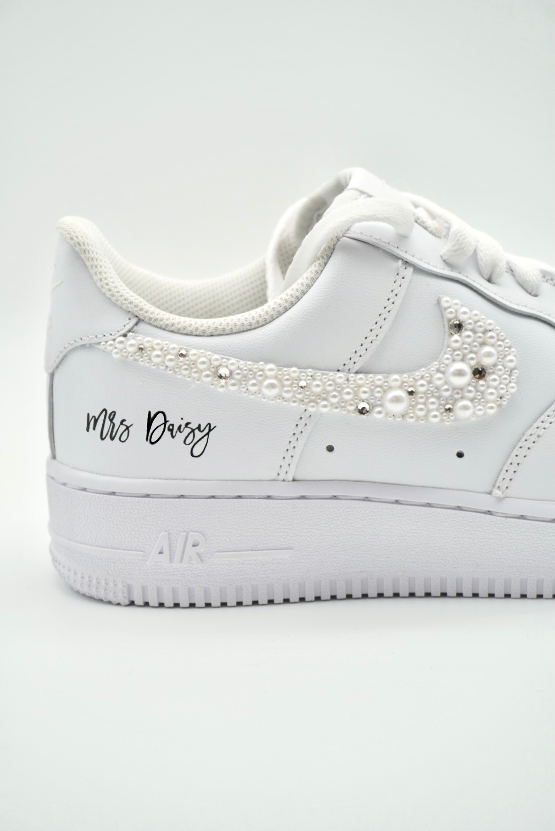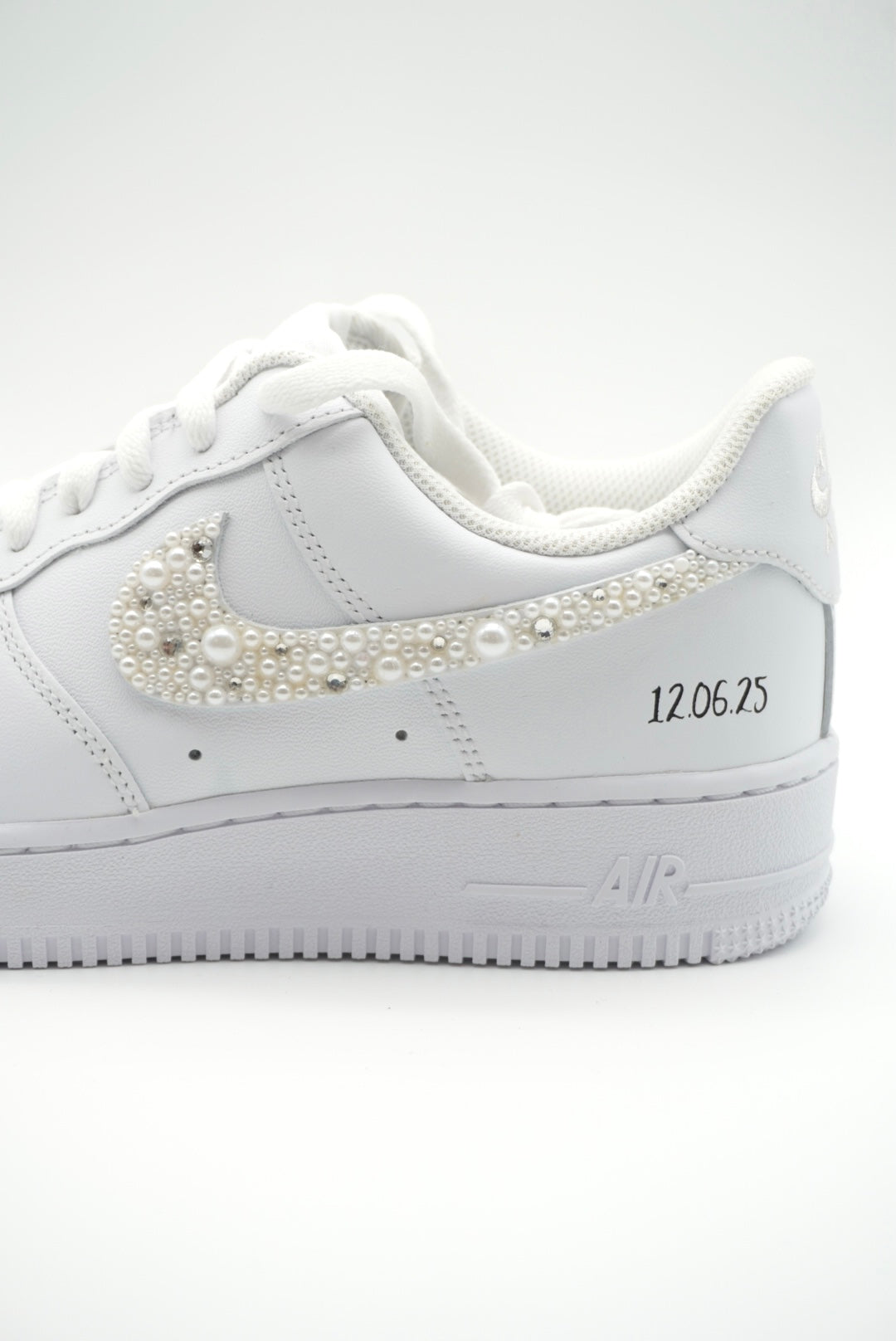 Ein zeitloser Klassiker trifft auf individuelle Eleganz: Die seitlichen Bereiche dieses Sneakers sind mit handgefertigten, schimmernden Perlen und glitzernden Steinchen verziert. Zusätzlich können die Schuhe mit Ihren persönlichen Initialen, einem besonderen Datum oder einer individuellen Botschaft gestaltet werden – perfekt für Hochzeiten, Jahrestage oder andere unvergessliche Momente. Die Kombination aus schlichten, eleganten Perlen und den klaren Linien des Air Force 1 Designs verwandelt diese Sneakers in ein unverwechselbares Statement, was deinen besonderen Tag noch besonderer macht.