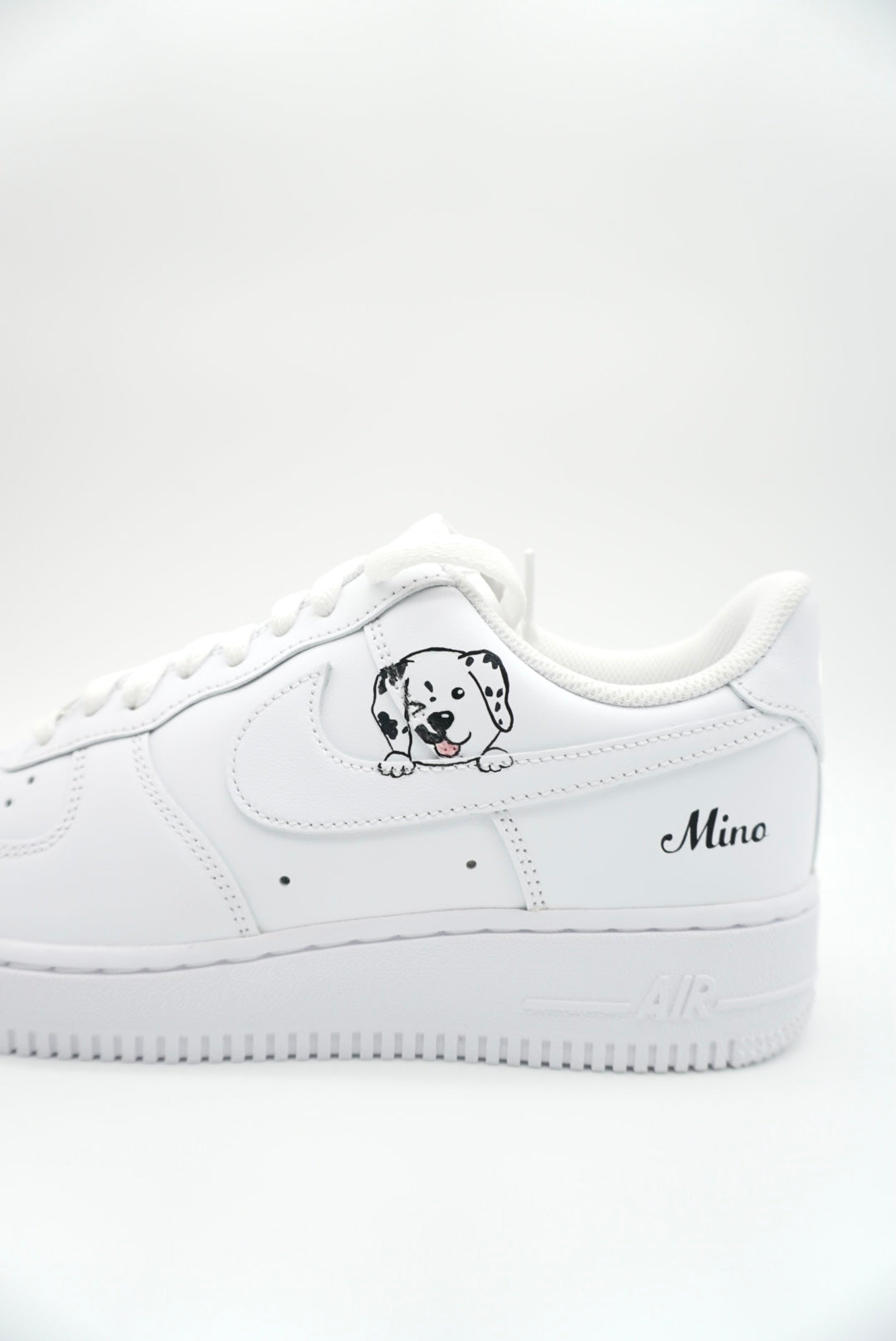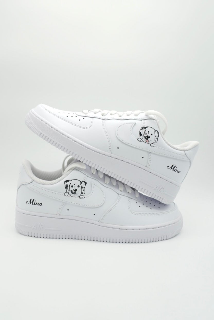 Diese Custom-Sneaker zeichnen sich durch liebevolle handgemalte Hunde-Illustrationen aus. Die Illustrationen zeigen dein Haustier, was den Schuhen eine ganz persönliche Note verleiht. Zusätzlich sind die Namen deines Haustieres auf den Außenseiten festgehalten. Jeder Schuh ist ein einzigartiges Kunstwerk und perfekt für Tierliebhaber, die modische Akzente setzen möchten.