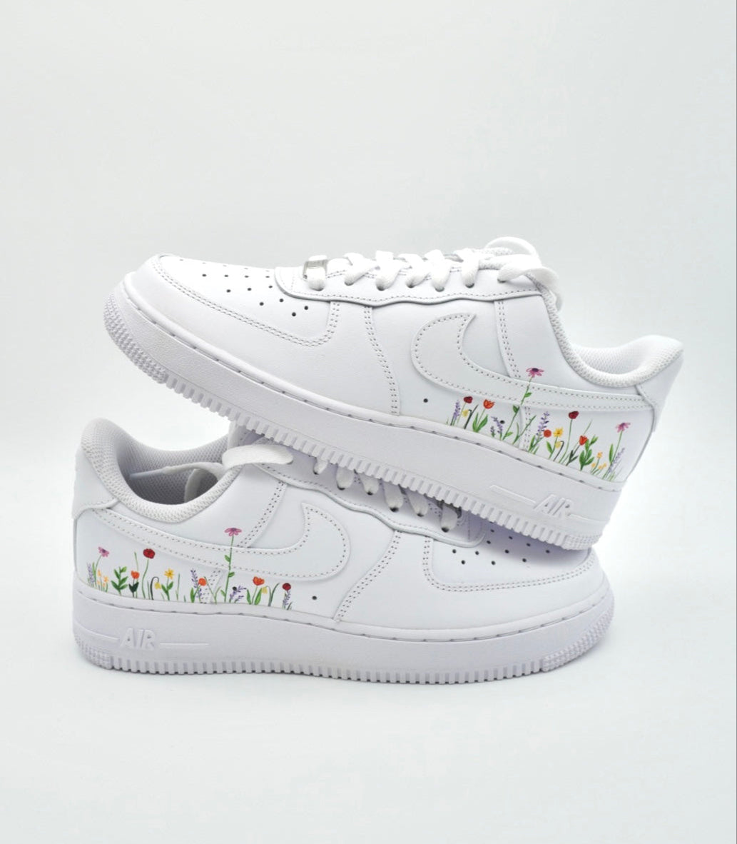 Diese Custom Sneaker wurden mit einem fröhlichen Blumen handbemalt. Die Sneaker sind im Allgemeinen eher Schlicht gehalten, dennoch sind sie durch die Blumen etwas ganz besonders. Die handbemalten Details machen jedes Paar zu einem einzigartigen Kunstwerk, das sich von der Masse abhebt und eine persönliche Note verleiht.